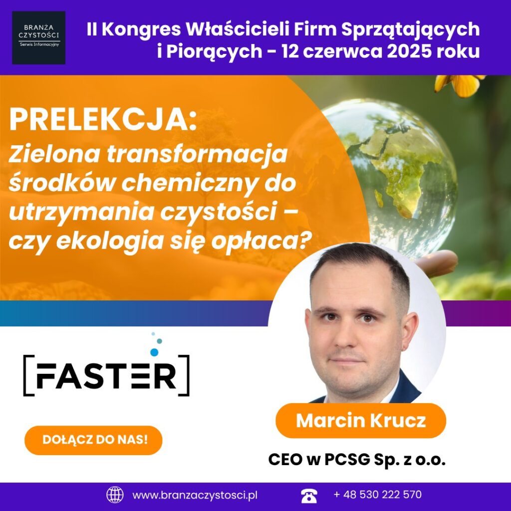 13:00 – 13:20 – Zielona transformacja środków chemiczny do utrzymania czystości – czy ekologia się opłaca?. – Marcin Krucz (Faster)