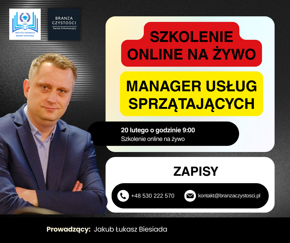 Już 20 lutego o godzinie 9:00 odbędzie się wyjątkowe szkolenie na żywo online dla osób, które chcą zostać Managerami Usług Sprzątających lub podnieść swoje kompetencje w zarządzaniu profesjonalnym utrzymaniem czystości. To praktyczne i interaktywne szkolenie, które pokaże Ci, jak efektywnie zarządzać zespołem sprzątającym, kontrolować jakość usług, optymalizować koszty i dobierać odpowiednie technologie sprzątania do każdego typu obiektu.